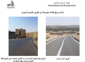 وأضاف رئيس الجهاز المركزي للتعمير، أنه تم الانتهاء من تنفيذ قرية الظهير الصحراوى (أبو سمبل) حيث تم إنشاء 50 بيتاً شاملة المرافق والخدمات، وجار استكمال تنفيذ قريتين بالظهير الصحراوى، هما “قرية أبريم الجديدة”، وبها 100 بيت شاملة المرافق والخدمات، و”قرية وادى العرب”، وبها 100 بيت شاملة المرافق والخدمات، كما انتهى جهاز تعمير جنوب الصعيد من إنشاء ورفع كفاءة مجموعة من الطرق التنموية ضمن الخطة الاستثمارية للجهاز بمحافظة أسوان بهدف تسهيل الحركة المرورية وخدمة المواطنين.