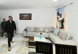 وتجول وزير الإسكان بعمارات محور الإسكان فوق المتوسط بسكن لكل المصريين، والتي تشتمل على أعمال تنفيذ ٨٥ عمارة سكنية تحتوي على ٢٠٤٠ وحدة كاملة التشطيب بمساحة ١٥٠ مترا مربعا في المتوسط وتنقسم إلى ٣ غرف، حمام ،مطبخ، وغرفة النوم الرئيسية بها حمام وغرفة ملابس، كما تفقد الوزير إحدى الوحدات المفروشة كنموذج بالمشروع.