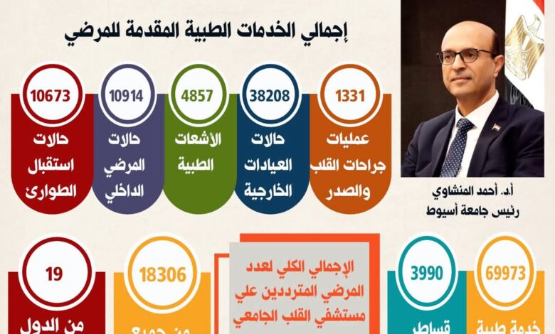 وتلقى الدكتور أحمد المنشاوي رئيس جامعة أسيوط؛ تقريراً يستعرض أبرز الخدمات التي قدمها مستشفى القلب بجامعة أسيوط، خلال عام ٢٠٢٤م، ودوره في تعزيز الخدمة الطبية في صعيد مصر؛ لمرضى القلب، والأوعية الدموية، وجراحاتها، ومرضى الجلطات القلبية الحادة، فضلاً عن إجراء أخطر ، وأدق عمليات جراحة القلب؛ بكفاءة عالية.