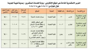 أعلن المهندس مصطفى سعيد أحمد رئيس جهاز مدينة طيبة الجديدة والمشرف على مدينة الأقصر الجديدة عن طرح فرص إستثمارية عن شهر فبراير ٢٠٢٥ للتخصيص الفوري على الموقع الإلكترونى لبوابة خدمات المستثمرين كالاتى : –