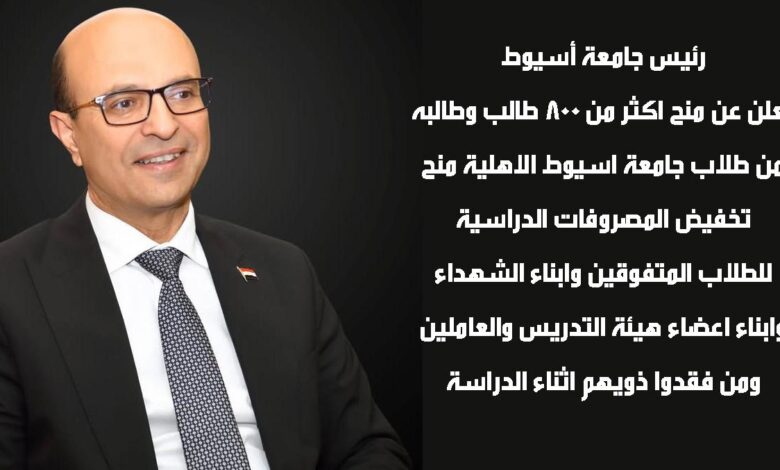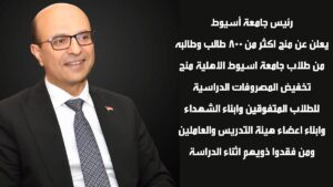 اعلن رئيس جامعة اسيوط الدكتور الدكتور احمد المنشاوى والمفوض بتسيير اعمال جامعة اسيوط الاهلية عن تخفيض المصروفات الدراسية لعدد٨٠٠طالب وطالبة من طلاب جامعة اسيوط الاهلية وذلك من الطلاب المتفوقين وأبناء الشهداء واعضاء هيئة التدريس والعاملين ومن فقدوا ذويهم اثناء الدراسة …جاء ذلك خلال .. ترأسه اجتماع لجنة تطبيق القواعد المنظمة لمنح الدراسة والتخفيضات المقدمة لطلاب جامعة أسيوط الأهلية..