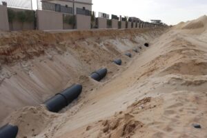 وفيما يتعلق بخطوط الصرف الصحى، جارٍ تنفيذ خطوط مشروعات صرف بأقطار 1400 مم، و1200 مم، و1100 مم، و1000مم بأعماق تتراوح بين 4 إلى 10 أمتار لكامل منطقة امتداد المدينة الجنوبي.