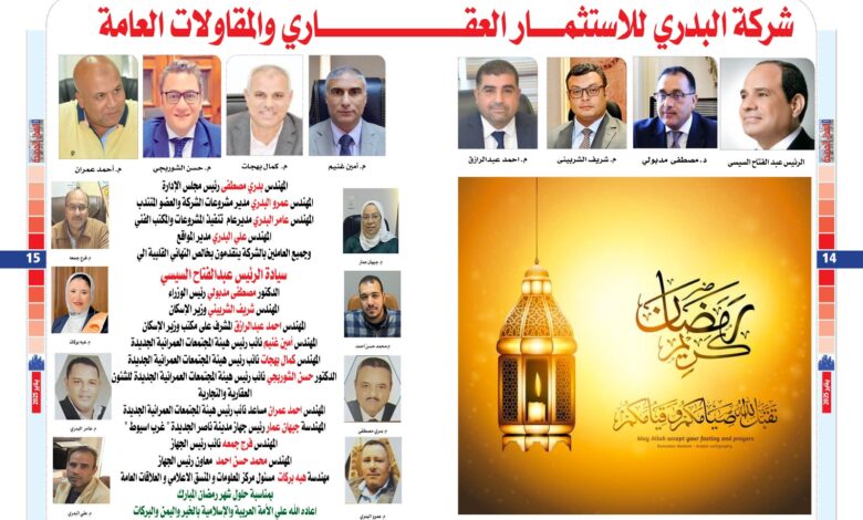 شركة البدري للإستثمار العقاري والمقاولات العامه تهنئ مسئولوا الإسكان وجهاز مدينة ناصر الجديدة “غرب اسيوط” بمناسبة حلول شهر رمضان المبارك