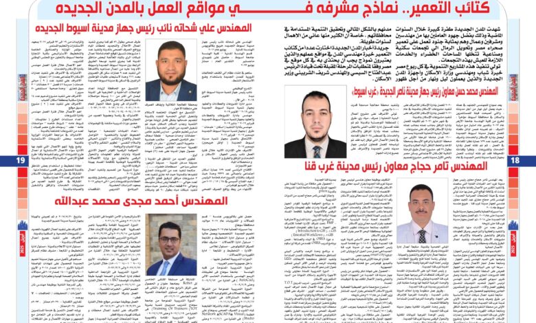 إختار محرر جريدة اخبار المدن الجديدة – New Cites News المختص بملف مدن الصعيد في عددها الورقي الاخير عددا من القيادات الشابه التي تعمل في مواقع العمل المختلفة وكانت لهم بصمة واضحة في تنفيذ المشاريع المسندة لهم ، حيث ساهم هولاء في تنفيذ الأعمال وفقا للبرنامج الزمني المحدد والمواصفات القياسية والفنية العالية ، و يأتي علي رأس القائمة التي تم ترشيحها المهندس علي شحاته نائب رئيس مدينة أسيوط الجديدة والمهندس محمد حسن معاون رئيس جهاز مدينة ناصر الجديدة (غرب اسيوط) والمهندس تامر حجاج معاون رئيس جهاز مدينة غرب قنا الجديدة والمهندس أحمد مجدي مسئول العلاقات العامة في جهاز مدينه اخميم الجديدة