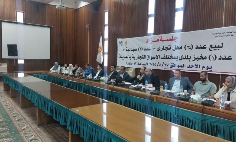 وعُقد بمقر جهاز مدينة 15 مايو جلسة مزاد علني لبيع 23 محلاً تجاريا ومخبز بلدي بمناطق متفرقة بالمدينة، وذلك بحضور المهندس علي سعد، رئيس الجهاز، وممثلي مجلس الدولة، ووزارة المالية، وهيئة المجتمعات العمرانية الجديدة للقطاع المالي و العقاري.