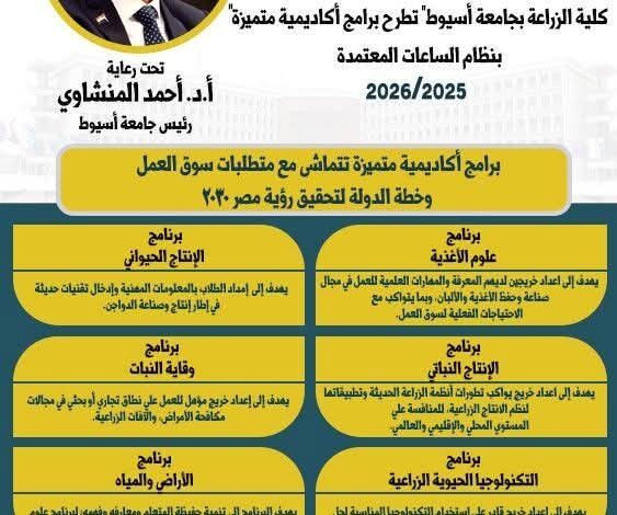 وفي هذا السياق، صرّح الدكتور أحمد المنشاوي، رئيس جامعة أسيوط، أن طرح كلية الزراعة لهذه البرامج الدراسية بنظام الساعات المعتمدة يأتي في إطار حرص الجامعة على تطوير منظومتها التعليمية بما يواكب متغيرات العصر، ويسهم في إعداد خريج متميز قادر على المنافسة في سوق العمل المحلي والإقليمي والدولي. وأكد أن الجامعة تولي اهتمامًا خاصًا بالبرامج الأكاديمية التي تدعم مجالات الزراعة والبحث العلمي، نظرًا لما تمثله من أهمية في تحقيق الأمن الغذائي ودعم خطط الدولة للتنمية المستدامة ورؤية مصر 2030، مؤكدًا على أن هذه البرامج تسهم في تخريج كوادر علمية مؤهلة قادرة على خدمة المجتمع وتحقيق التنمية الشاملة.