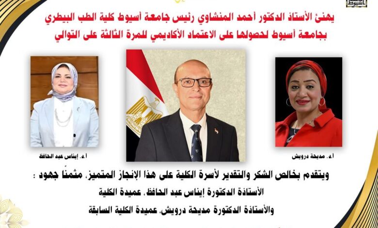 بعد الانتهاء من عملية المراجعة الشاملة لنظام إدارة الجودة بالكلية واستيفاء جميع معايير الجودة والاعتماد المطلوبة حصلت كلية الطب البيطرى بجامعة أسيوط على الاعتماد الأكاديمى للمرة الثالثة على التوالى فيما هنأ الأستاذ الدكتور أحمد المنشاوي، رئيس جامعة أسيوط، أسرة كلية الطب البيطري بمناسبة الحصول على الاعتماد الأكاديمي للمرة الثالثة على التوالي، بعد الانتهاء من عملية المراجعة الشاملة لنظام إدارة الجودة بالكلية واستيفاء جميع معايير الجودة والاعتماد المطلوبة، مؤكدًا أن هذا الإنجاز يعكس التزام الكلية بالتميز الأكاديمي والجودة في التعليم والتدريب، وجهودها المستمرة في تطوير البرامج التعليمية والبحثية.