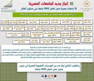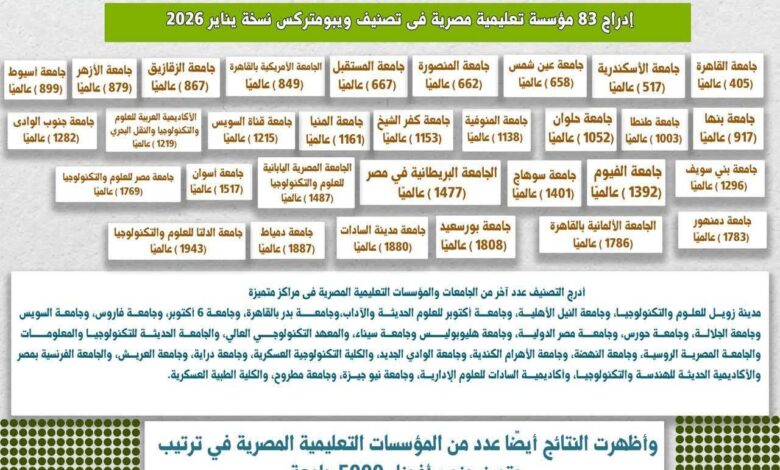 ويبرز تصنيف ويبومتركس يناير 2026؛ حجم الإنجاز الذي حققته الجامعات المصرية، حيث يُظهر إدراج 83 مؤسسة تعليمية مصرية ضمن التصنيف العالمي، وتواجد 10 جامعات مصرية في المراكز المتقدمة عالميًا، مع توضيح ترتيب جامعة أسيوط بين هذه الجامعات، بما يعكس المكانة المتقدمة التي تحتلها الجامعة على المستويين المحلي والدولي، ويؤكد قوة الحضور الرقمي والبحثي للجامعات المصرية في التصنيفات العالمية.