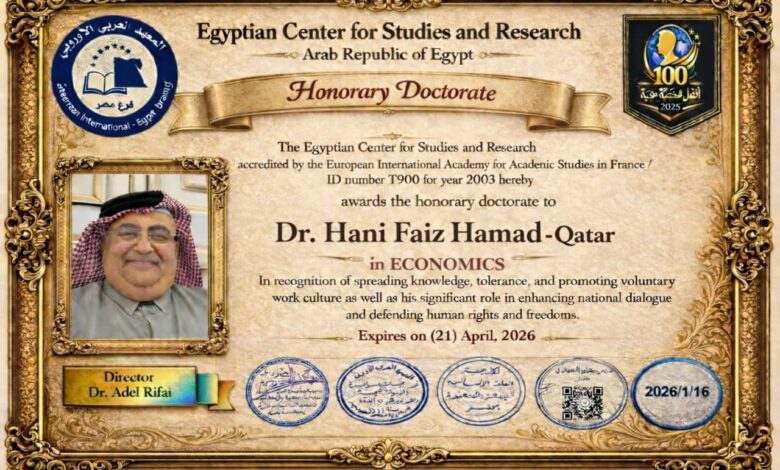 أعلن المعهد العربي الأوروبي بفرنسا متمثل في مركز المصرريين للدراسات الاقتصادية اختيار الدكتور هاني فايز حمد ضمن أفضل 100 شخصية عربية في مجال الاقتصاد ، وذلك نظرا لدورة البارز في التحليل وقراءة الأحداث ومتابعة التطورات الاقتصادية العالمية.